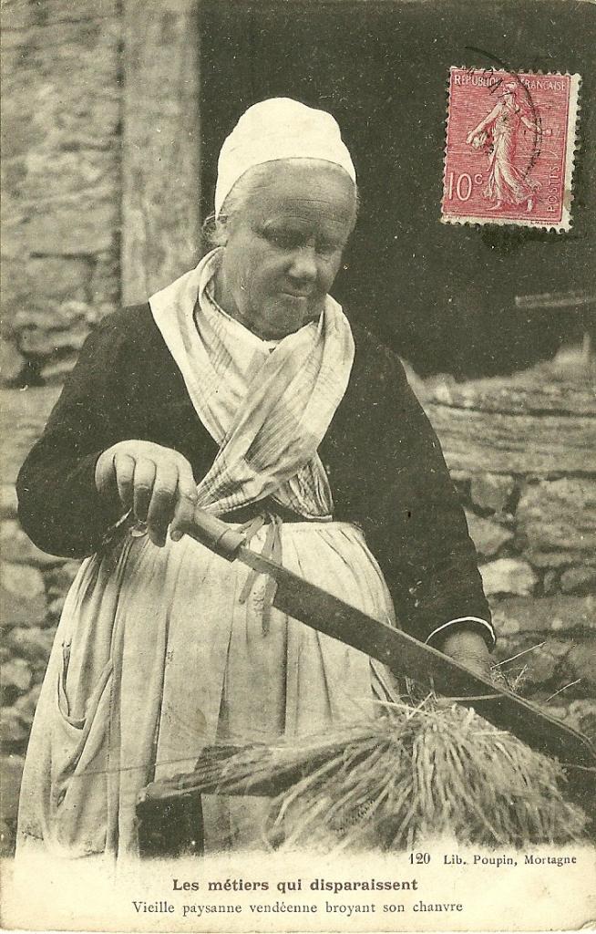 Les métiers qui disparaissent, vieille paysanne broyant son chanvre.